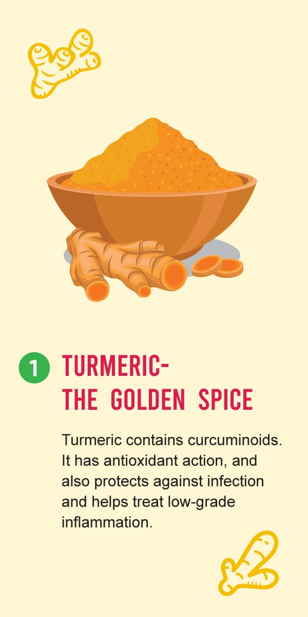 Turmeric contains curcuminoid as its active ingredient which is responsible for its powerful, antiseptic, anti-inflammatory and antioxidant properties. It helps to prevent the growth of bacteria, virus and fungi, and thus helps your body prevent and fight off infections. You can add turmeric to any food, or mix it with your soups, smoothies, milk/water.