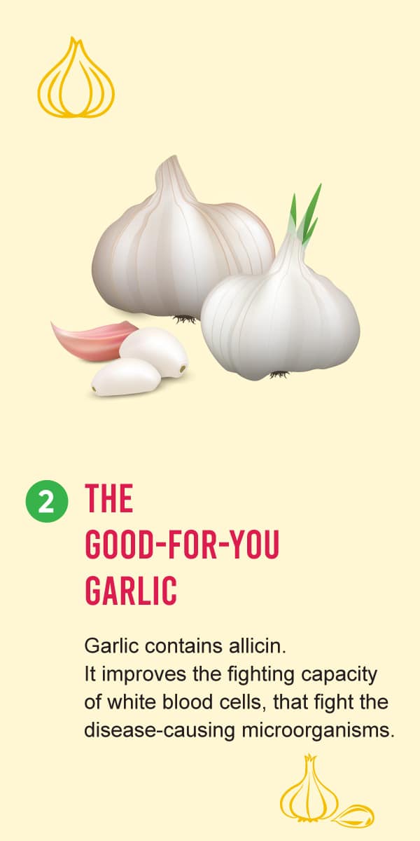 Garlic contains a compound called allicin which helps to improve the fighting capacity of white blood cells, which are the major cells involved in immunity. These cells protect the body against infections and foreign substances. As raw garlic provides better health benefits, you can add freshly crushed or chopped garlic with any food of your choice.