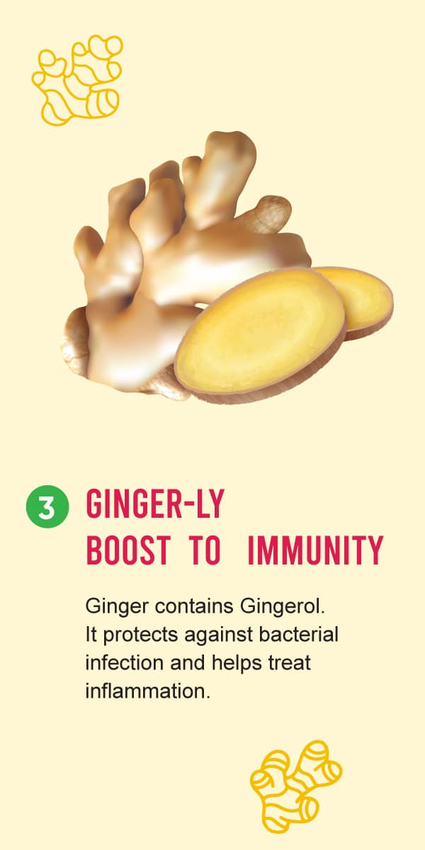 Ginger is a widely used ingredient in food and ayurvedic medicines. It is known for its anti-bacterial and anti-inflammatory properties. Ginger contains an active component called Gingerol, which makes ginger an excellent immunity-booster. It prevents harmful bacteria/virus from attacking the body. You may add ginger to your curries, soups, salads and teas and consume every day to improve your immunity and lower your chances of developing infections.