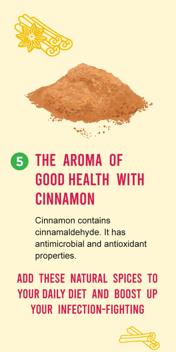 Cinnamon contains a compound called cinnamaldehyde which is responsible for its antimicrobial and antioxidant properties. Through these properties, cinnamon as immune booster can help fight various kinds of infections caused by bacteria, virus and fungi. It also helps in repairing damaged tissues. Thus, it works as an effective immunity enhancer. You may add cinnamon in your tea, coffee, desserts, curries, or any other beverages of your choice.