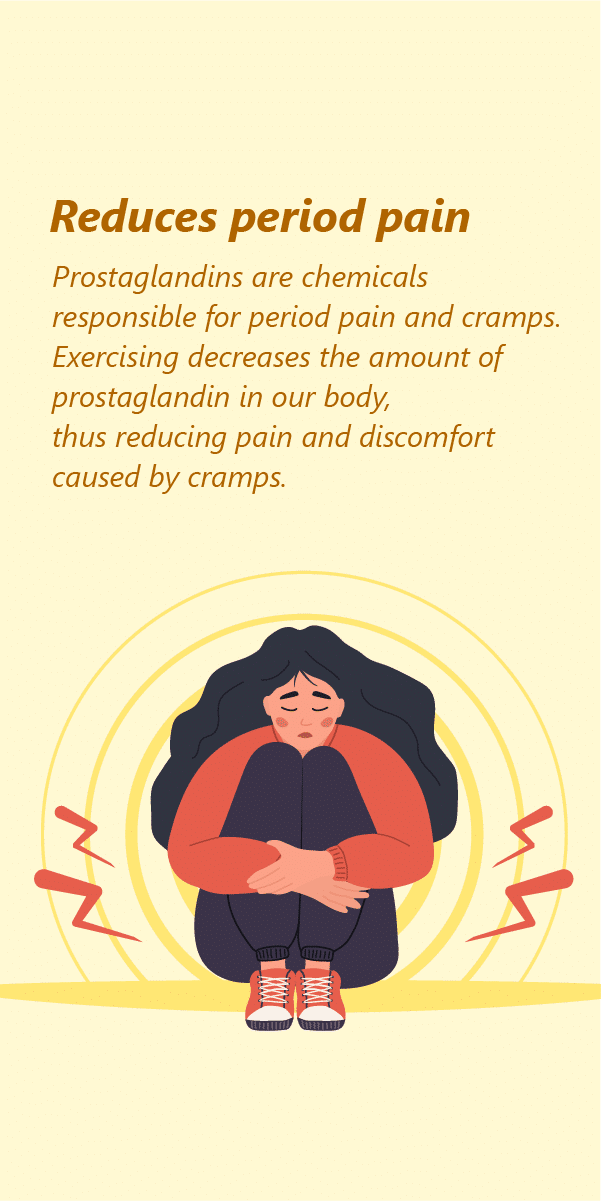 Almost every woman has experienced mood swings during their period days. Regular exercise is known to increase the production and release of happy hormones like endorphins, serotonin, and dopamine. As the name suggests, these hormones influence your mood and make you feel positive and confident to face any challenges headed your way!