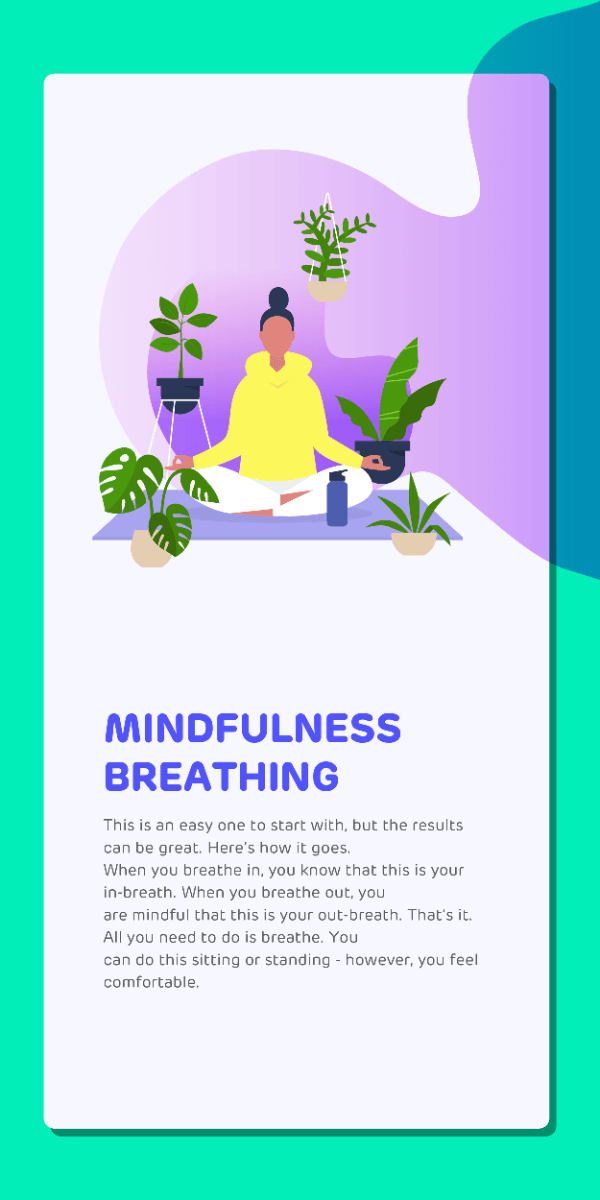 • Mindful breathing: This is a very easy exercise but can have great benefits. When you breathe in, recognise it as ‘in-breath’ and when you breathe out, recognise it as ‘out-breath’. Focus all your attention on breathing in and breathing out. At first, you might notice your mind wandering off. Don’t worry, that’s natural. Eventually, with enough focus, you’ll notice the chatter in your mind will begin to quiet down.