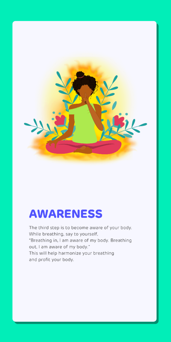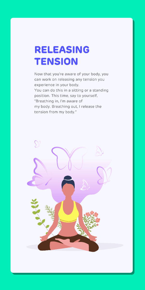 • Body scan:Take some time to scan the different parts of your body – be it your face, extremities, abdomen, etc. Note areas of discomfort, if any. Take a deep breath into each area of the body where this discomfort exists. Also, notice areas of your body that feel relaxed and comfortable. Breathe into these areas too. Notice the change you feel with each breath.