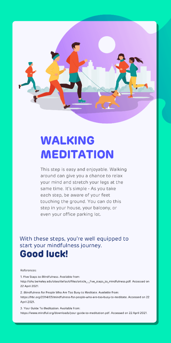 • Mindful walking:Take a walk outside or around your room or in your office parking lot. Pay attention to the sensation of your feet in contact with the ground. Let go of thoughts, emotions, and other distractions and just walk as if being mindful of every step is vitally important. Come back to focusing every time your mind wanders. Doing this will allow you to stretch your legs and relax your mind.