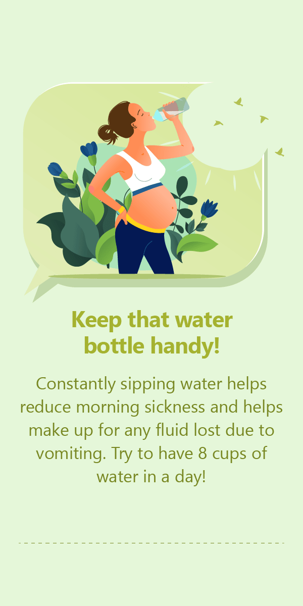 - Water is one of the most important yet neglected nutrients. During morning sickness, you tend to feel nauseous and sometimes throw up. This puts you at the risk of dehydration. Experts recommend that you drink at least 8 cups of water a day to keep your body hydrated.
